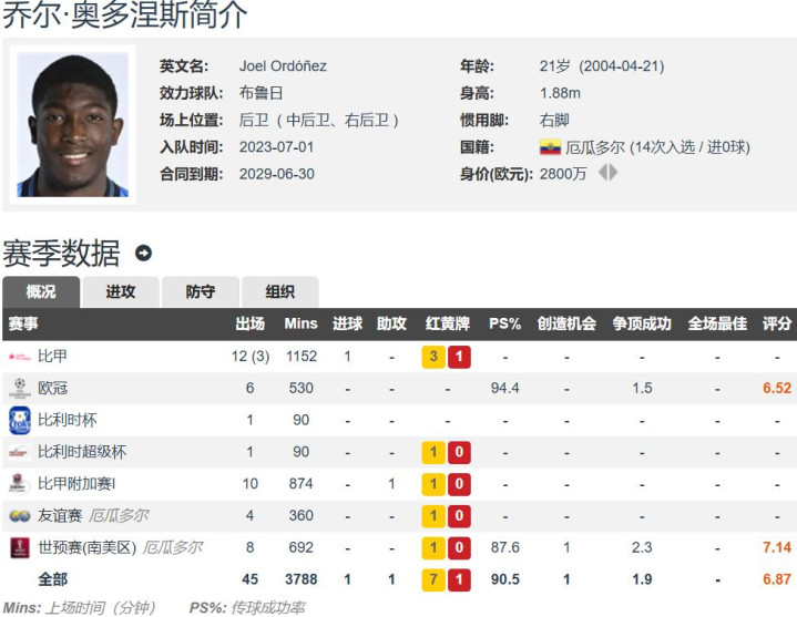 奥多涅兹现年21岁,身高1.88米,不错踢中卫,也不错踢右后卫,德转估价2800万欧元,是布鲁日队内身价第二高的球员,现存条约至2029年。奥多涅兹是布鲁日的后防田主力,出战了15场比甲的比赛,其中12次首发,打入1球;欧冠首发出战6次。