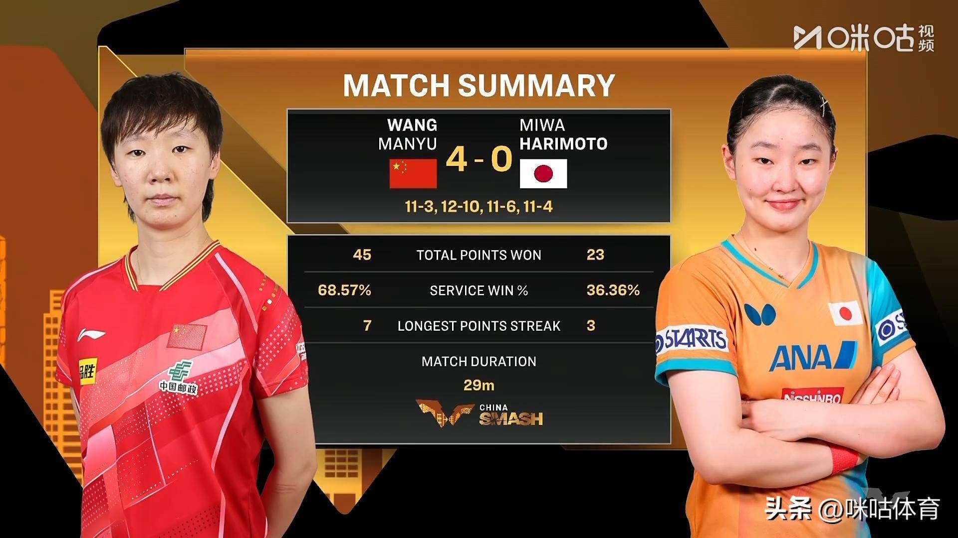 第四局比赛张本好意思和只可链接加质地格杀,但效力依旧不好,暂停事后张本好意思和链接丢分,最终王曼昱11比4胜仗拿下,以4比0的总比分淘汰张本好意思和,晋级女单四强。