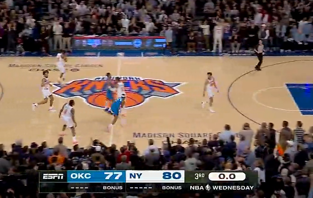 虎扑03月05日讯 NBA老例赛,尼克斯主场迎战雷霆的比赛正在进行中。